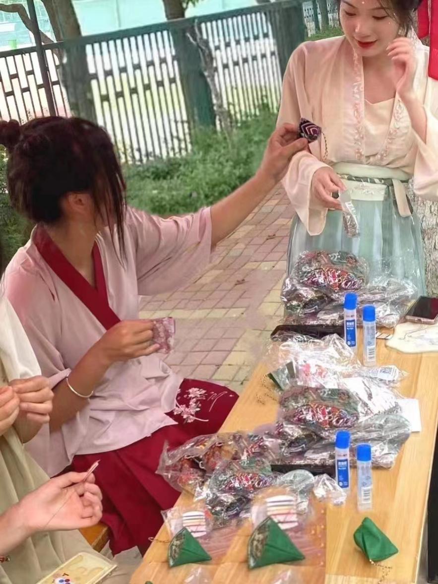 在活动现场,工作人员现场教学折纸龙舟、手工制作粽子香囊,同学们进行端午节知识有奖问答,内容丰富多彩。到场参与的同学们热情洋溢、其乐融融,一起穿针引线,一起探讨交流。一个个小巧玲珑的粽子香囊不断被大家缝制出来,装上挂绳显得尤为沁人心脾,香囊虽小,承载着端午民俗美好的愿望,为这个端午节增添了不一样的色彩!汉服社的学生们身穿汉服,尽显魅力,受到了同学们的瞩目并纷纷合影留念。
