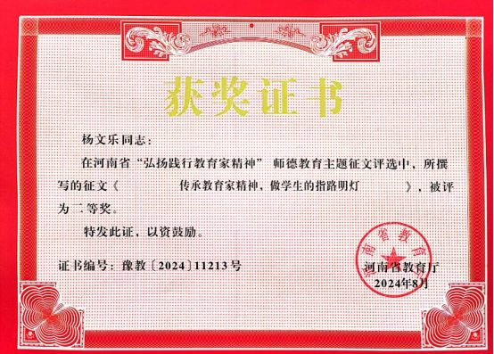 近日,河南省教育厅公布了“弘扬践行教育家精神”师德主题教育征文获奖名单,pg游戏电子官网杨文乐老师的征文《传承教育家精神,做学生的指路明灯》在此次征文评选中荣获二等奖。