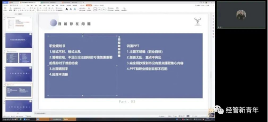 张宝宇从职业生涯计划书如何撰写、职业生涯大赛如何演讲、参赛过程中存在的问题,这三个方面为参赛选手详细进行了讲解与解读,并结合自身实际参赛情况,以打比方、举例子等方式,帮助学生更清晰了解比赛全过程。最后还鼓励所有同学多去参加类似大赛,从比赛中提高自身专业素质,锻炼提升个人能力。此次赛前培训会,帮助参赛学生丰富参赛知识及参赛技巧,为后期pg游戏电子官网学生顺利参与比赛奠定基础。