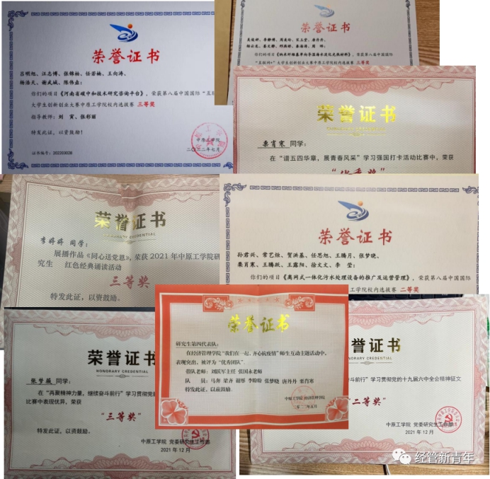 同学们积极参加各类赛事,表现突出,获得多项奖项,尤其在“互联网+”、“挑战杯”等重要赛事中取得了优异的成绩。获“挑战杯”河南省大学生创业计划竞赛金奖1项;第八届“互联网+”大学生创新创业大赛省级三等奖1项;第八届“互联网+”大学生创新创业大赛校级一等奖1项,二等奖1项,三等奖2项;第八届“挑战杯”大学生创业计划竞赛校级二等奖1项。1人作品《同心送党恩》,在研究生红色经典朗读活动中获三等奖;1人在“谱五四华章,展青春风采”学习强国打卡活动比赛中获优秀奖;1人在第十六届研究生学术论坛中获优秀论文鼓励奖;2人在马理论宣讲团征稿活动中获优秀奖;2人在“学习贯彻党的十九届六中全会精神征文”活动分获二等奖、三等奖。该班同学还积极参加学院组织的活动,2人在“疫情下的我们”主题作品征集活动中分获一等奖、二等奖;在“我们在一起,齐心抗疫情”师生互动活动中被评为优秀团队……