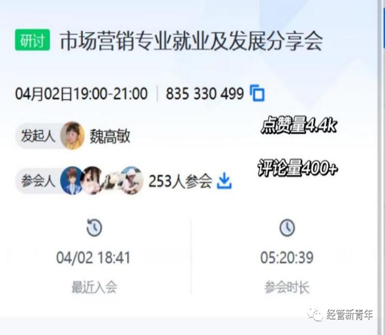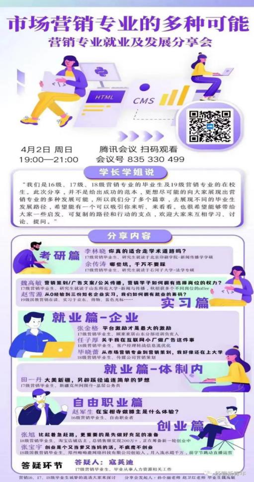 4月2日晚七点,pg游戏电子官网市场营销专业13位校友与在校生通过腾讯会议平台进行了线上就业创业经验分享和交流。学院党委副书记王琳、团委书记郭姗、市场营销系主任赵卫红、副主任孙小丽及200余名师生参加了此次会议。