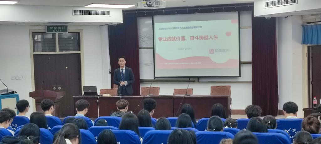 10月24日,pg游戏电子模拟器“听学长分享就业创业的‘平凡之路’”讲座在龙湖校区四号楼311举行。郑州星彦营销战略咨询集团创始人雷阳、经理鹿正阳应邀开展讲座,pg游戏电子官网21级、23级营销专业同学参加,讲座由学生工作办公室副主任杨文乐主持。