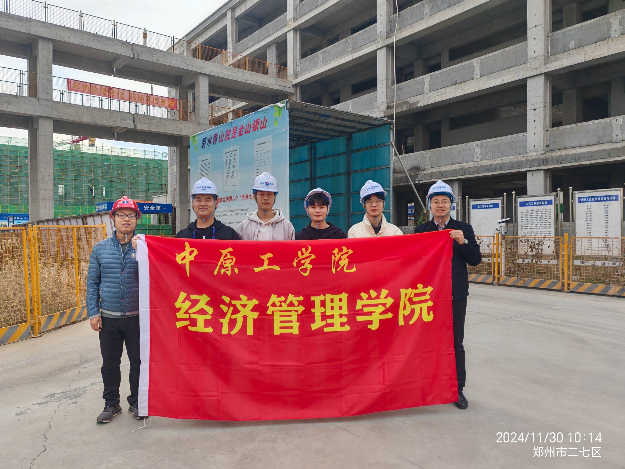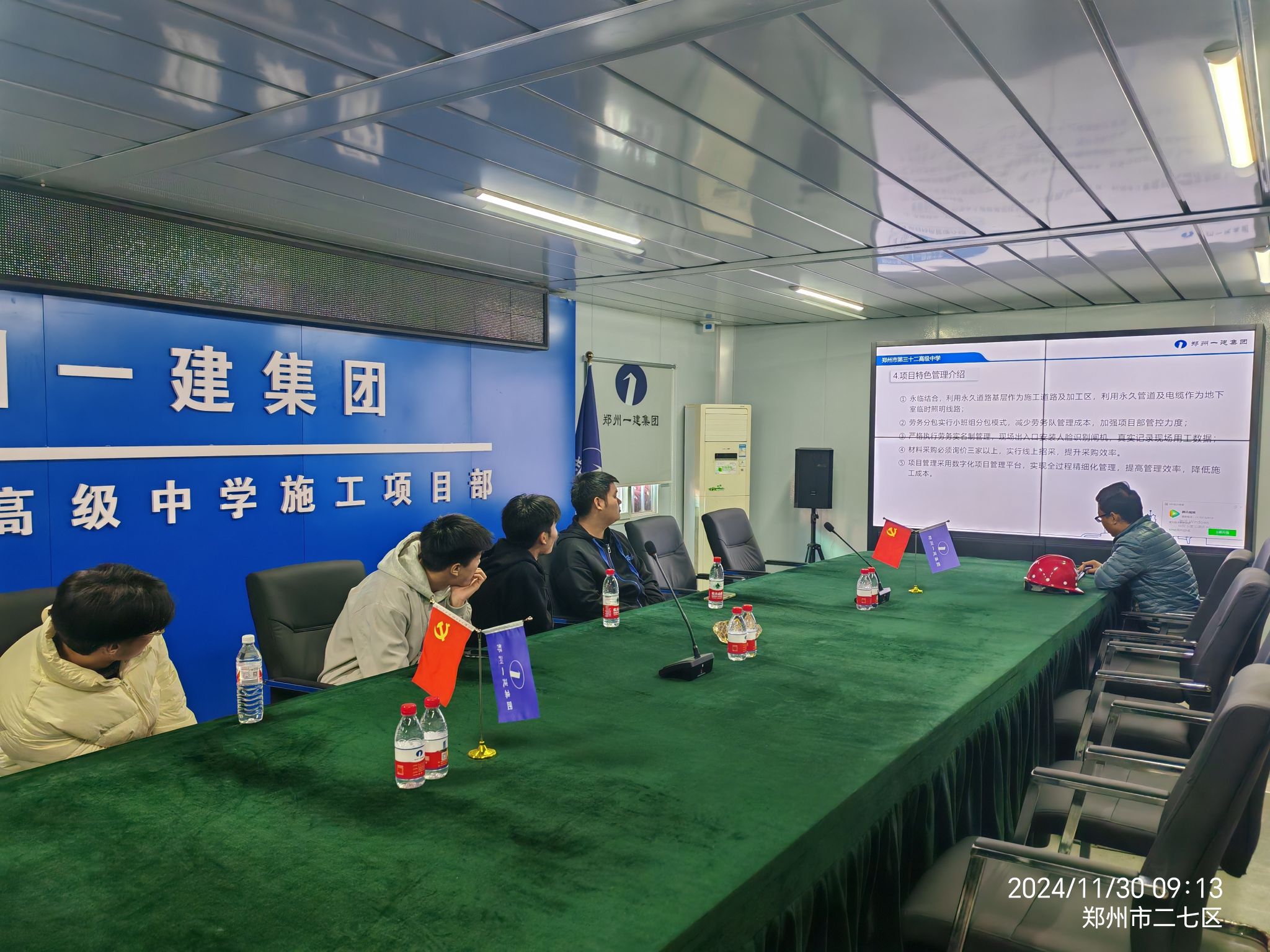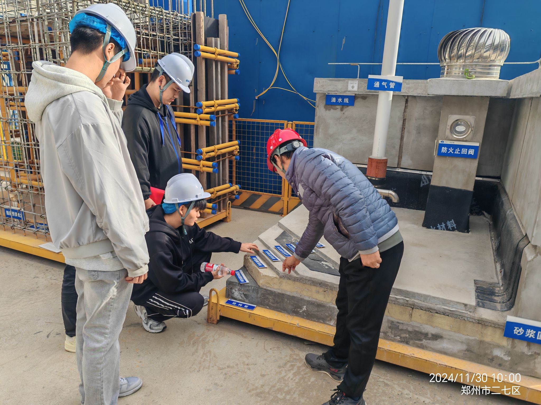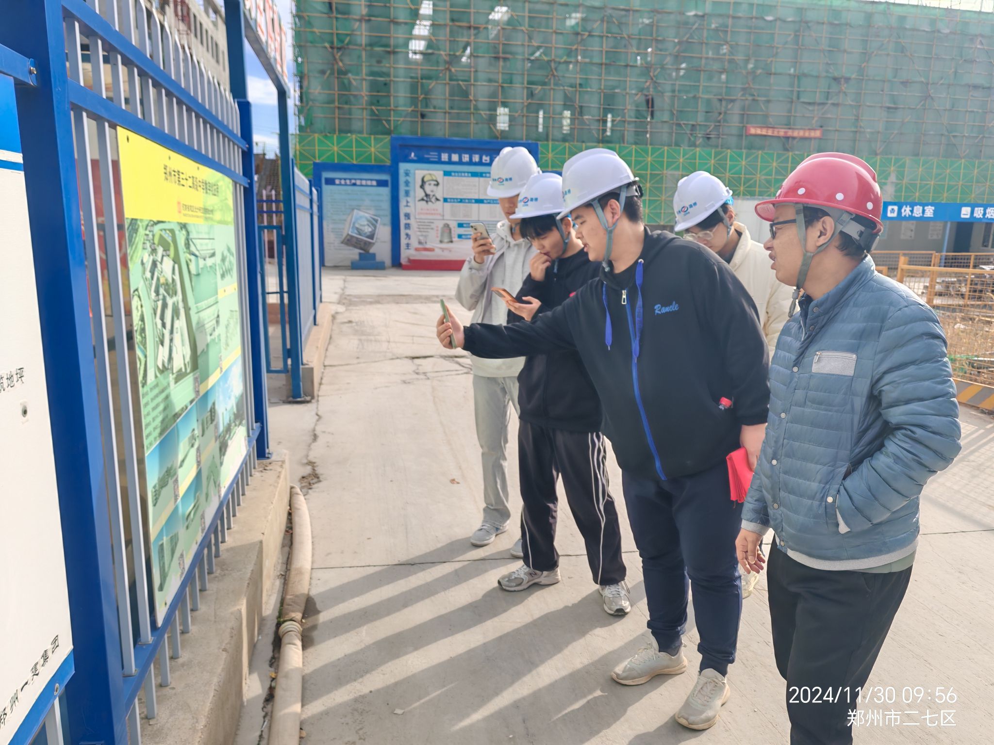 在郑州市三十二中建设项目,学生们听取了项目总工的汇报,认真学习了项目全寿命周期管理、智慧化管理、标准化管理及空心楼盖内膜抗浮定位工法、大跨度变截面空腹桁架屋面施工等技术。