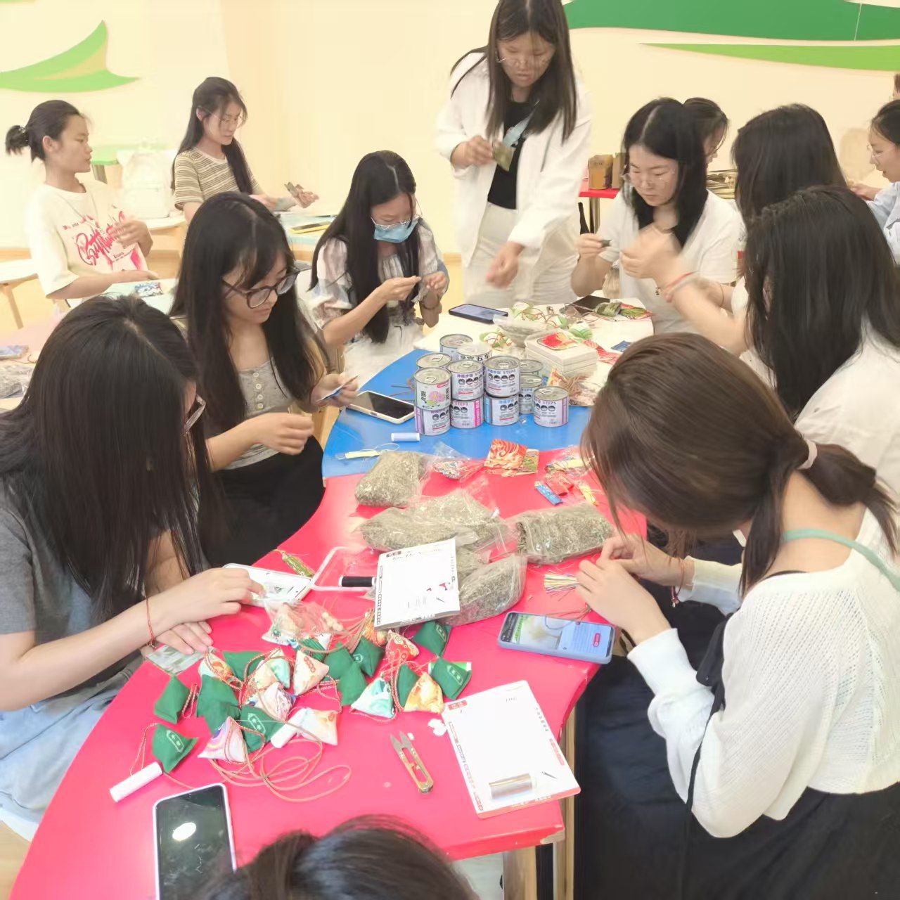 活动现场,工作人员准备好了艾草、布料、彩色丝线、装饰珠串和针线等材料。制作香囊时,同学们大展身手,认真学习,穿针引线,将艾草等香料装入香囊。一个个色彩斑斓、香气四溢的香囊便制作完成。五彩绳环节,从配色设计到结扣收尾,同学们在一针一线中感受传统技艺的魅力,寄托着大家对健康平安的美好祈愿。在知识猜猜乐中,同学们积极抢答,对端午节的历史渊源、传统习俗等知识了如指掌,展现出大家对传统文化的热爱和了解。最具创意的"端午探案剧本推理"区域,将古风探案与端午习俗深度融合。参与者化身"端午密探",通过破解与粽子配方、龙舟赛制等节日元素相关的线索,展开沉浸式剧情推演。