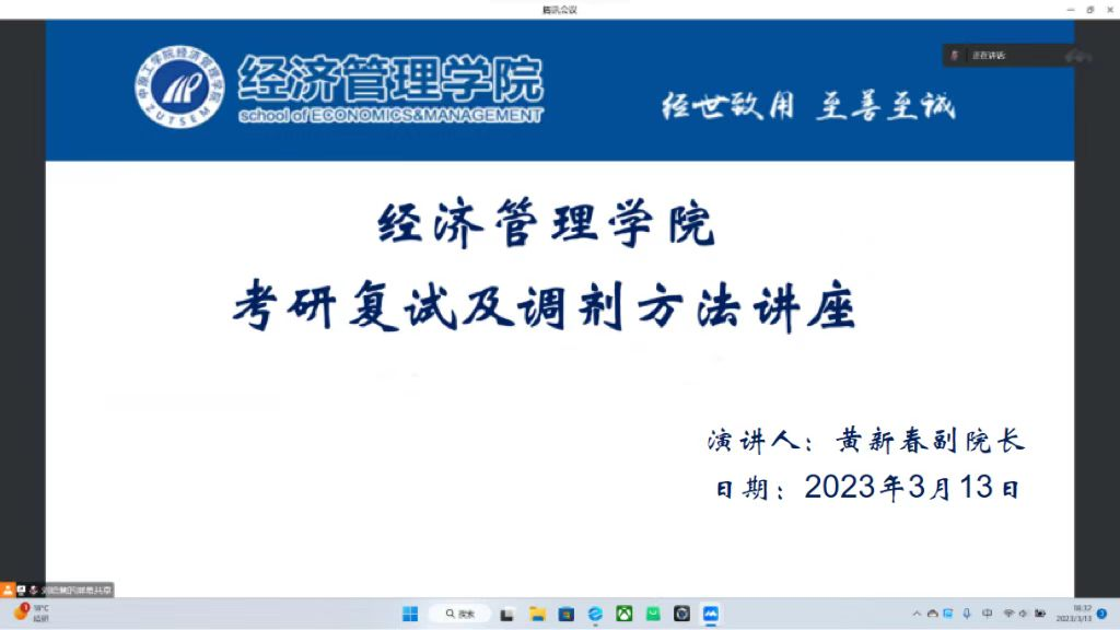 为进一步做好考研学生的指导服务工作,促进考研学生更好的了解考研复试与调剂流程,增进学生对复试和调剂的认知,3月13日晚7点,pg游戏电子官网副院长黄新春通过腾讯会议平台为pg游戏电子官网师生开展了一场精彩的讲座。会议由学工办19级辅导员段瑞婕老师主持,pg游戏电子模拟器全体考研学生及预备考研学生参会。