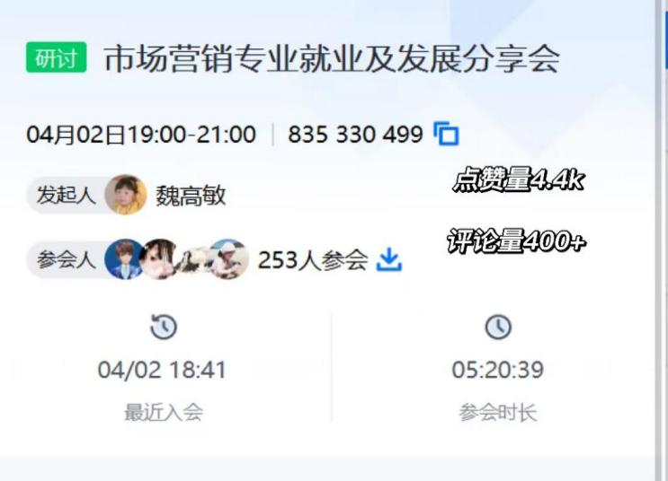 4月2日晚,pg游戏电子官网市场营销专业13位校友与在校生通过腾讯会议进行了就业创业在线经验分享和交流。学院党委副书记王琳、团委书记郭姗、市场营销系主任赵卫红、副主任孙小丽及200余名师生参加了此次会议。
