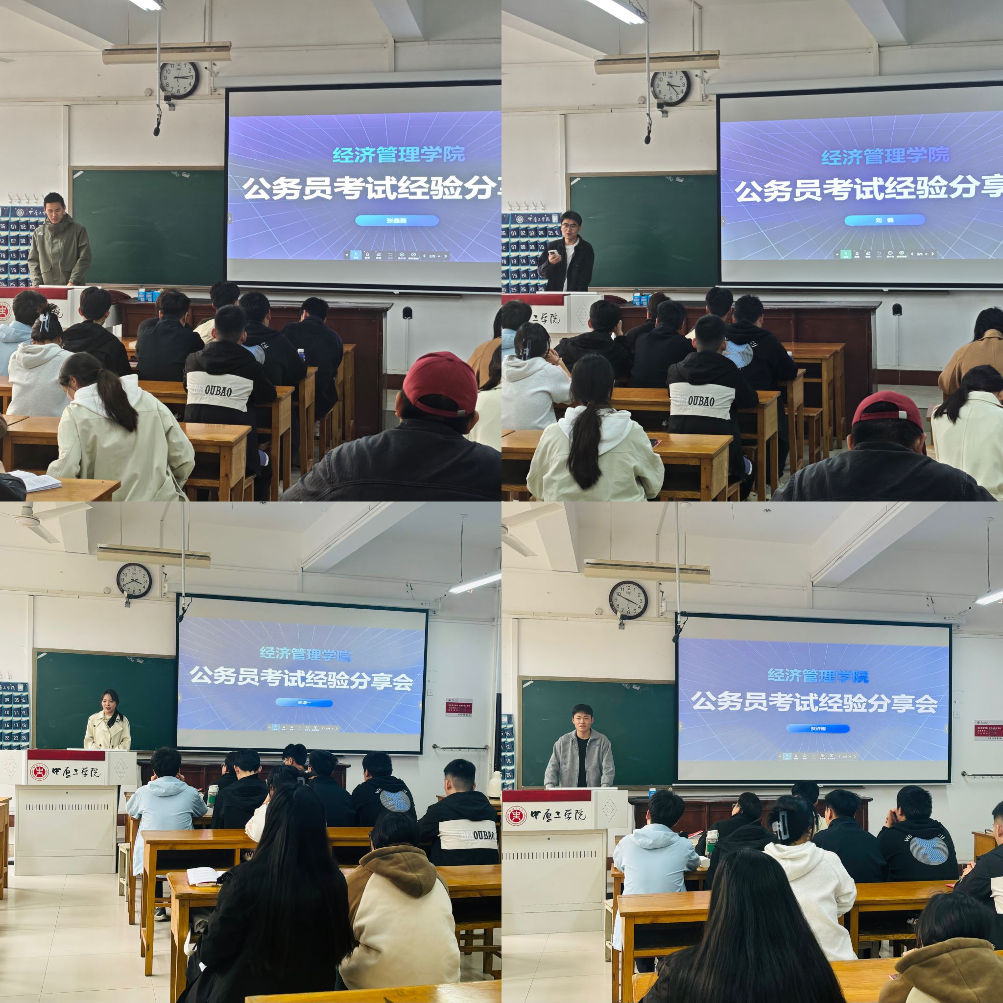 随后,2021级学生张鑫磊、刘鹤、王淑一、贺许耀结合自身经历,分别从“如何准确了解考试信息”、“如何制定学习计划”、“如何科学选择复习资料”、“如何提高面试上岸概率”四个方面分享了备考经验。面对同学们的提问,4位同学耐心地一一解答,现场气氛热烈。在场同学表示:“学长学姐的经验分享真实而有用,为我们提供了宝贵的参考。同时也使我们坚定了备考信心,相信自己也能成功上岸”。
